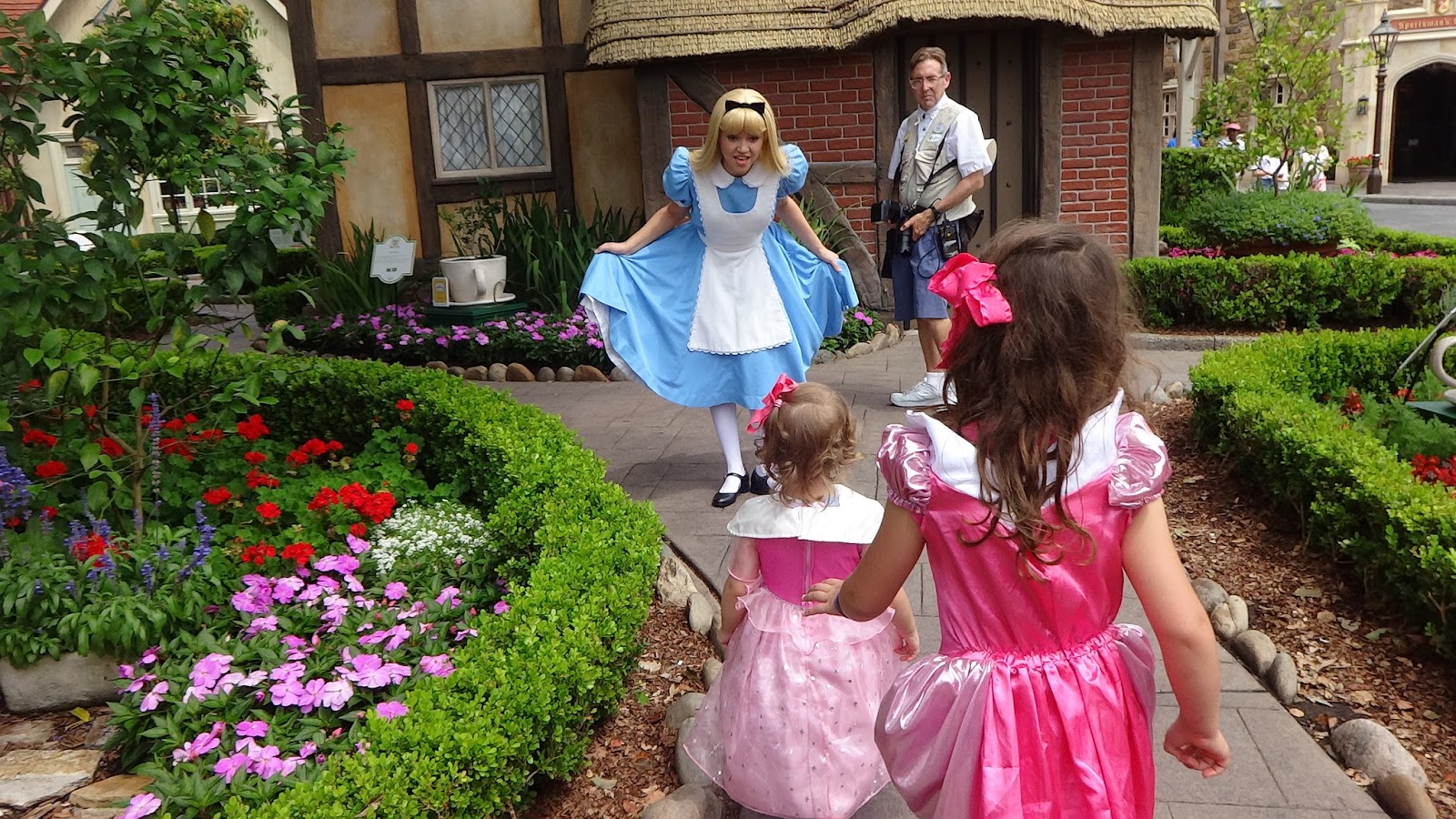 Our first day at EPCOT was centered in Futureworld, but this day was almost entirely on the World Showcase loop. We went to France early to visit with Belle, then back through England to visit Mary Poppins and Alice. Davis and I searched for Perry the Platypus in England, and had fun altho it takes quite awhile. We also got a souvenir golf ball in our special agent quest. We also found that both Magan and Ruby become fussypants when the temp hits 90 degrees before 11, and Ruby tended to actually need a spanking each morning just to make sure she was ready for the day. Belle had a nose bleed on the bridge into france, and her first concern was making sure she did not get her dress dirty.
