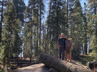 We finally arrived at Sequoia National Park, which basically means absolutely nothing as to how close you are to the trees, and stopped at the Welcome center for our first experience of the COVID rules at the national parks in CA. Wow, the welcome center could only allow for 4 people at a time, and with a family of 4 in there before us, the line did not move. While there, magan captured the picture of the van with writing in the dust on the back saying "She go up hill slow, Sorry", and Magan said we have to get going quick or we will be behind them. Have I mentioned how slow I drive in these blogs yet, well, that van passed us later. And the rode that was later was so longggg and windy. And there was a large rock that we slowly got close to (Moro Rock, maybe?). I think everyone in our car was getting sick, and this was the first time I found that looking out of the car to the side turned me into an indian screaming.